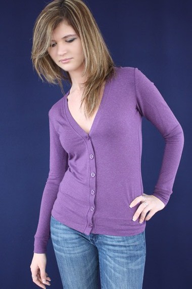 ОписаниеСиреневый жакет из шерстяной ткани, на пуговицах, с V- образным вырезом.