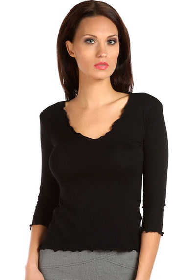 Элегантная черная кофточка с рукавами длиной 3/4. Модель украшена оборками по рукавам, низу изделия и красивому глубокому вырезу.